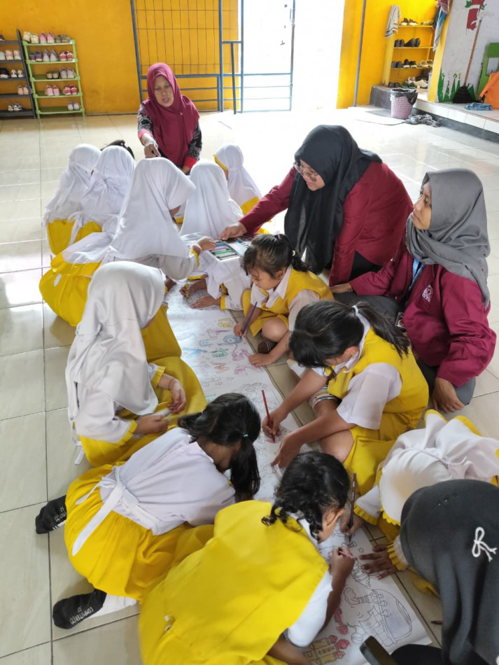 Pelaksanaan kegiatan dilaksanakan pada tanggal 29 Januari 2026. Dalam kegiatan tersebut, anak-anak menggambar secara berkelompok pada media yang telah disediakan. Setelah selesai, hasil karya bersama ditempelkan pada dinding kelas sebagai bentuk apresiasi terhadap kreativitas anak. Kegiatan ini tidak hanya melatih keterampilan motorik halus melalui aktivitas menggambar dan mewarnai, tetapi juga membantu meningkatkan rasa percaya diri, kemampuan komunikasi, serta interaksi sosial anak sejak usia dini.